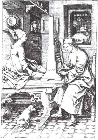 Рассмотрев части дома, обратимся теперь к его обстановке. В то время комнаты не загромождались мебелью. Вокруг стен расставлялись крепкие деревянные скамьи, иногда с богатой резьбой; на скамьях клались подушки. Были в употреблении и кресла. Столы отличались массивностью. Они опирались не на четыре ножки, а на два устоя, соединенные друг с другом поперечной перекладиной. Иногда верхняя доска делалась из какого-нибудь камня или покрывалась различными изображениями: тут можно было видеть Соломонов суд, Юдифь с головою Олоферна, жертвоприношение Авраама и т. п. Большою любовью пользовались низенькие шкафчики на ножках. Тяжеловесные шкафы и сундуки предпочитали ставить или в особенных, отведенных для этого комнатах, или в сенях. Иногда такие шкафы вставлялись в нишу, сделанную в стене. Бывало, что шкафы заменялись полками, на которых расставлялись предметы домашней утвари. Необходимую принадлежность каждой комнаты составлял рукомойник с висящим около него полотенцем. Зеркала употреблялись выпуклые; они вставлялись обыкновенно в круглые, реже — в четырехугольные рамы. Изображение в таких выпуклых зеркалах получалось довольно непривлекательное.
