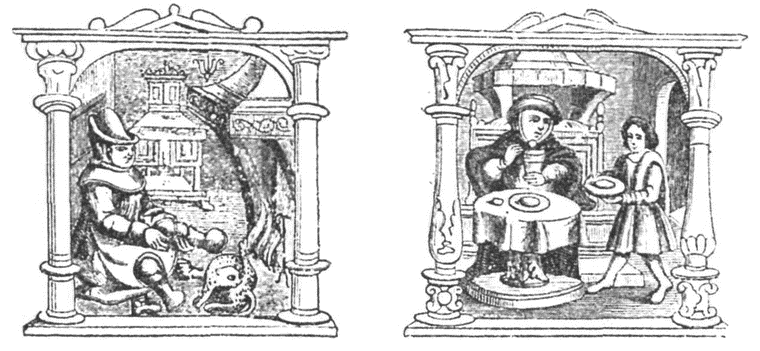 Двери комнат отличались солидностью и также украшались резьбою. Пол имел обыкновенно вид огромной шахматной доски, так как составлялся из чередующихся между собою каменных плиток белого и красного цветов. В доме зажиточного горожанина обязательно был просторный камин. Его устройство можно представить вполне определенно. Верхнюю часть составляет колпак. Он покоится на двух выступающих вперед каменных косяках и доходит до самого потолка. От нижней части колпака выступает широкий карниз, на который ставятся различные безделушки; с обеих сторон его приделаны подсвечники. На каменном полу самого камина поставлены два тагана. Перед камином на большой скамье любимое место хозяев в холодную зимнюю пору, когда за стенами дома сыплет снег и разгуливает холодный ветер. В других комнатах топятся изразцовые печи. Их было принято ставить на ножки, и с первого взгляда они очень походили на огромный шкаф или буфет. У одной средневековой