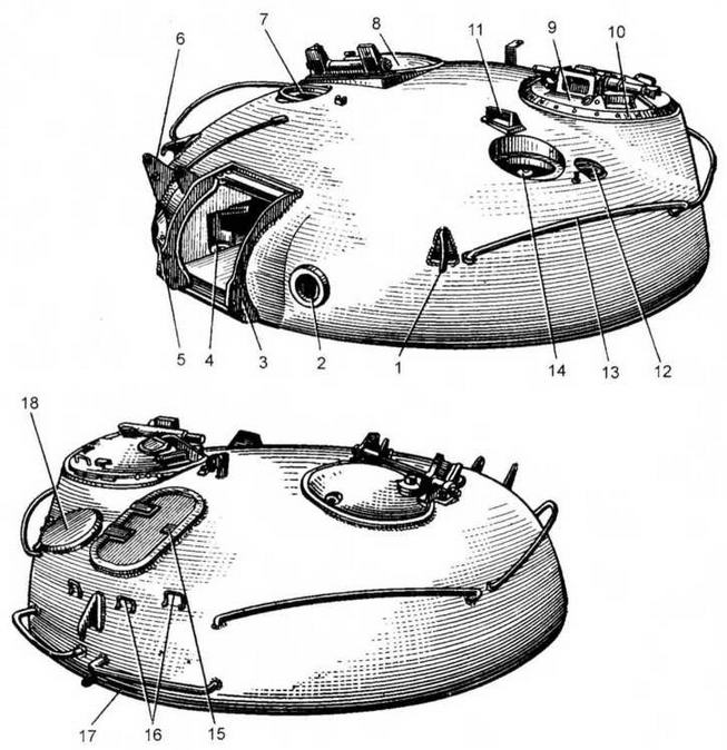 1 — крюк; 2 — амбразура прицела; 3 — защитная планка; 4 — расточка для цапфы люльки пушки; 5 — амбразура пулемета; 6 — кронштейн для крепления ИК-прожектора; 7 — отверстие для установки прибора наблюдения заряжающего; 8 — крышка люка заряжающего; 9 — люк командира танка; 10—броневое кольцо; 11 — прибор наблюдения наводчика; 12 — отверстие для антенного ввода; 13 — поручень; 14 — отверстие для установки прицела ТПН-1; 15 — крышка люка выброса гильз; 16 — скобы крепления брезента; 17 — отверстие для выброса отсепарированной пыли; 18 — броневой грибок