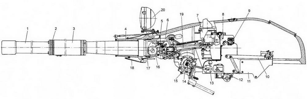 1 — ствол пушки; 2 — компенсирующее кольцо; 3 — ресивер эжекционного устройства; 4 — подвижная бронировка пушки; 5 — крыша башни; 6 — люлька пушки; 7 — ночной прицел ТПН-1; 8 — рычаг повторного взвода; 9 — боковой уровень; 10 —рамка механизма выброса; 11 — ограждение пушки; 12 —рычаг механического спуска ударника; 13 — рукоятка выбрасывателей; 14 — подъемный механизм; 15 — приспособление для снятия заклинивания пушки; 16 — обойма цапфы; 17 — внутренний чехол пушки; 18 — наружный чехол пушки; 19 — прицел ТШ 2Б-41; 20—ИК-прожектор Л-2Г