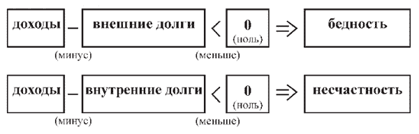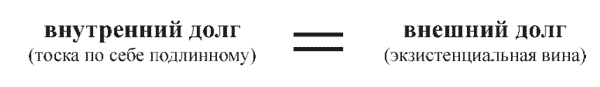 На самом деле, формула не так однозначна. Эмоциональное состояние человека с «отрицательным балансом» очень сильно зависит от того, из чего состоит экзистенциальный долг. Если он представлен в основном внешней составляющей – человек просто чувствует себя бедным. На самом деле он находится в позиции должника, его долги «съедают» его доходы. Но иногда такой долг можно перекрыть. Например, одна моя клиентка подсчитала, что ее долг перед отцом составляет восемьдесят тысяч долларов. Она была финансистом и во всем любила точность. Ей хотелось эти деньги заработать и отдать: купить папе дом и машину. И после этого быть свободной. Или другой пример, недавно мои давние клиенты побывали на тренинге, где их постарались убедить в том, что без нового джипа и особняка на пятьдесят комнат они просто нищие люди. Типичный вариант внешнего долга, который похож на внутренний. Но идея-то привнесена извне!