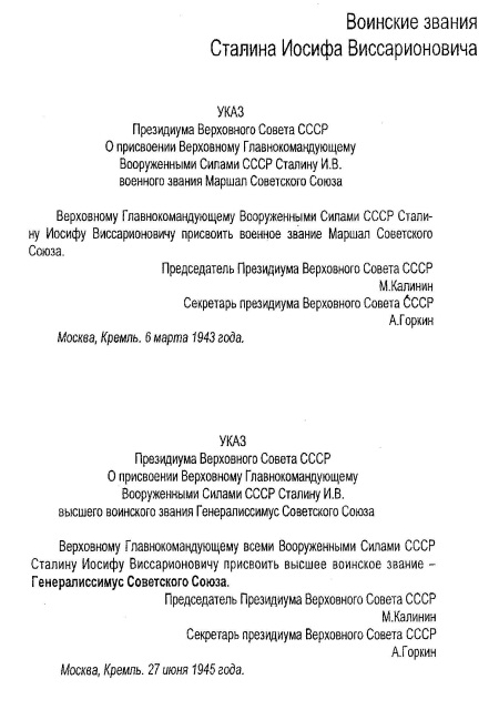 Сталин не признавал обращения к нему «Иосиф Виссарионович» (тем более «Дорогой Иосиф Виссарионович»). Он просил обращаться просто «товарищ Сталин». Когда И.В. Сталину было присвоено звание Маршал Советского Союза, его по-прежнему следовало называть «товарищ Сталин». Сам И.В. Сталин ко всем обращался по фамилии или на «вы». И только Шапошникова называл по имени-отчеству – Борис Михайлович, затем Рокоссовского – Константин Константинович.