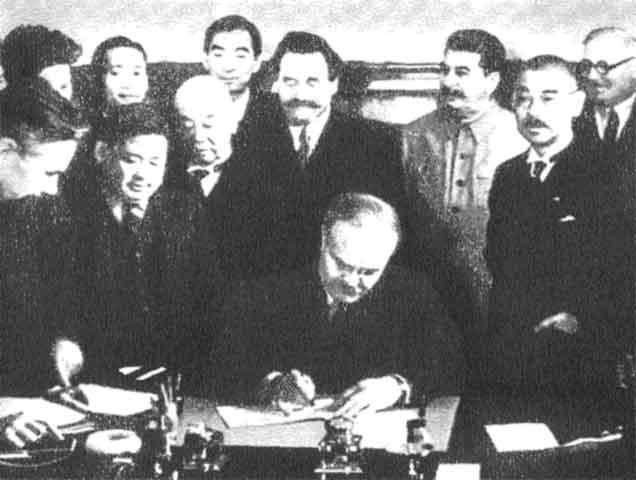 Министр иностранных дел Японии Маиуока (справа) и В. М. Молотов во время подписания пакта о нейтралитете
