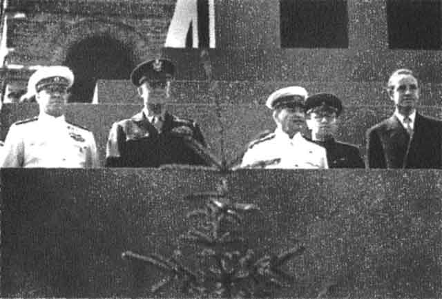 Маршал Советского Союза Г. К. Жуков, генерал Д. Эйзенхауэр, И. В. Сталин, генерал армии А. И. Антонов, посол США в СССР А. Гарриман на трибуне мавзолея. 12 августа 1946г.