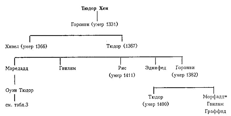 Пережив беспокойные времена правления Эдуарда I, потомки Эднифеда Фичана зажили наконец мирно и благополучно. Судьбы двух сыновей Горонви, сына Тюдора Хена, прекрасное тому подтверждение. Один из них — Хивел — священник, другой — Тюдор — землевладелец.