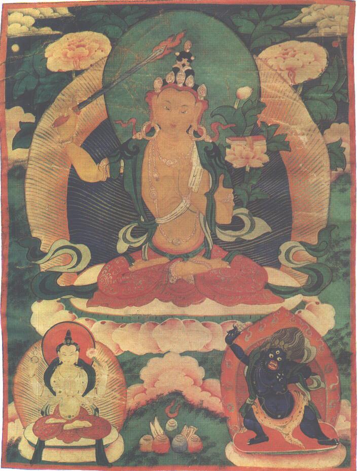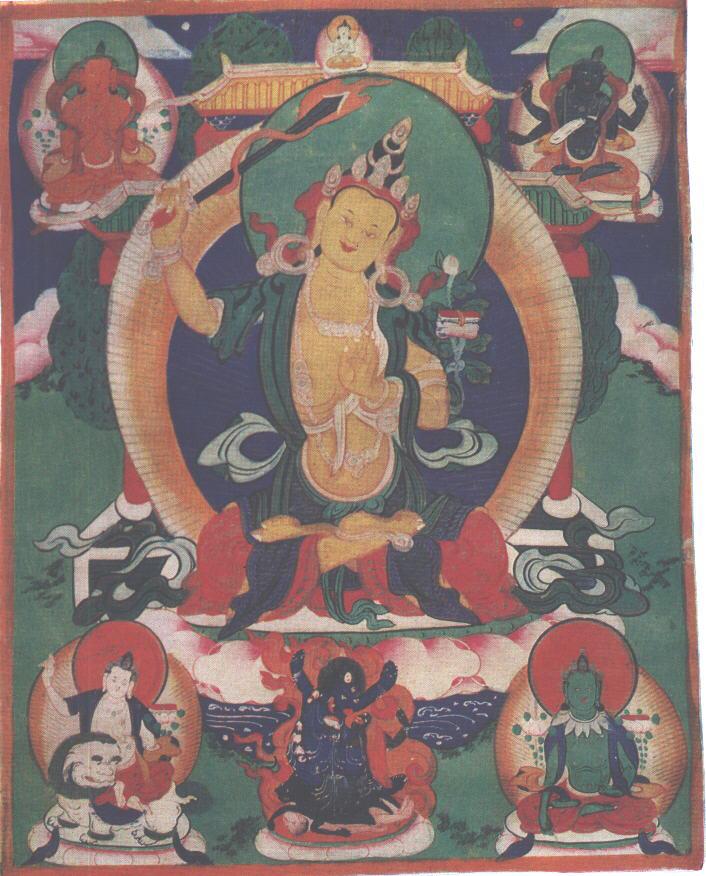 В богатом венце, ожерельях и браслетах. В правой руке - меч, в левой - лотос, на котором лежит книга Праджняпарамита. имб - зеленый, большой нимб - синий и розовый; сидит на лотосе. Пейзаж горный. Наверху - Алмазнопрестольный Будда. По углам - бодхисатвы.