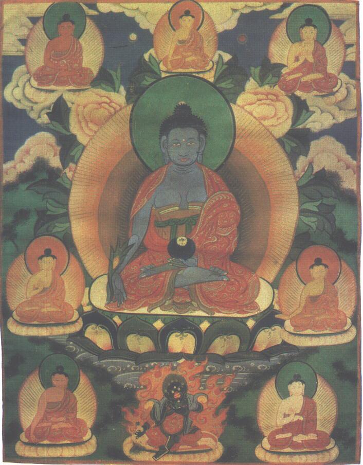 Синий; в правой руке - цветок миробалана, в левой - патра, нимб - зеленый; сидит на лотосе. Кругом (сверху и с боков) - семь фигур будд, внизу - дхармапала.