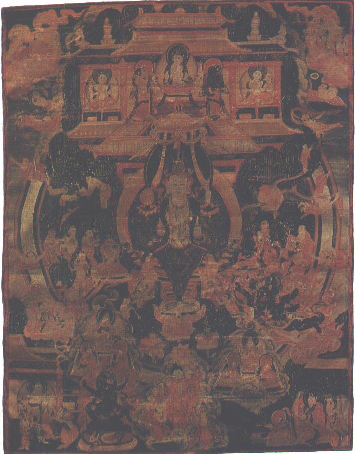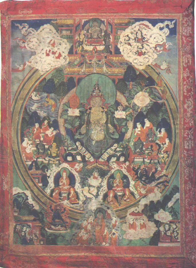 На нем богатый венец, зеленая одежда, прикрывающая оба плеча, чулки и золотые туфли. Цвет - золотой; мудра молитвы. Вокруг него - адоранты и архаты, среди которых Цзонхава. Рядом с ним - дхармапала, по-видимому, Махакала. С другой стороны, за пределами круга, - Яма. Наверху - Алмазнопрестольный Будда в пагоде. У трона - две женские фигуры, золотая и черная. Кругом - облака, на коих сидят адоранты. Внизу - Майтрейя в виде будды, окруженный адорантами.