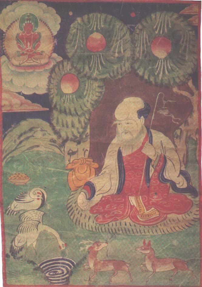 Буддийский отшельник с посохом. Сидит под сенью большого дерева. Он лыс, имеет монгольские усы и длинную бороду. Одет в красную, нижнюю, и светло-серую, верхнюю, одежду и желтые туфли. Справа от него - узелок с пищей. Перед ним - блюдо, к которому пришли кормиться чета фазанов и чета оленей. а фоне неба - Алмазнопрестольный Будда.