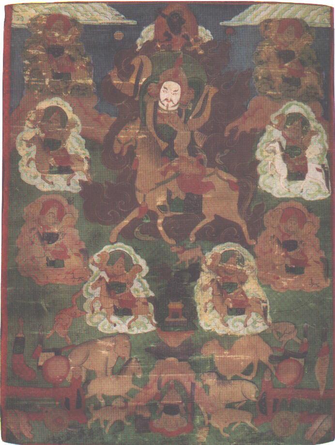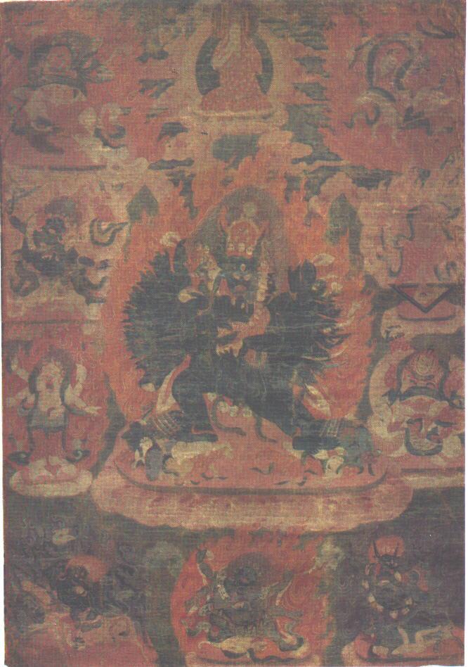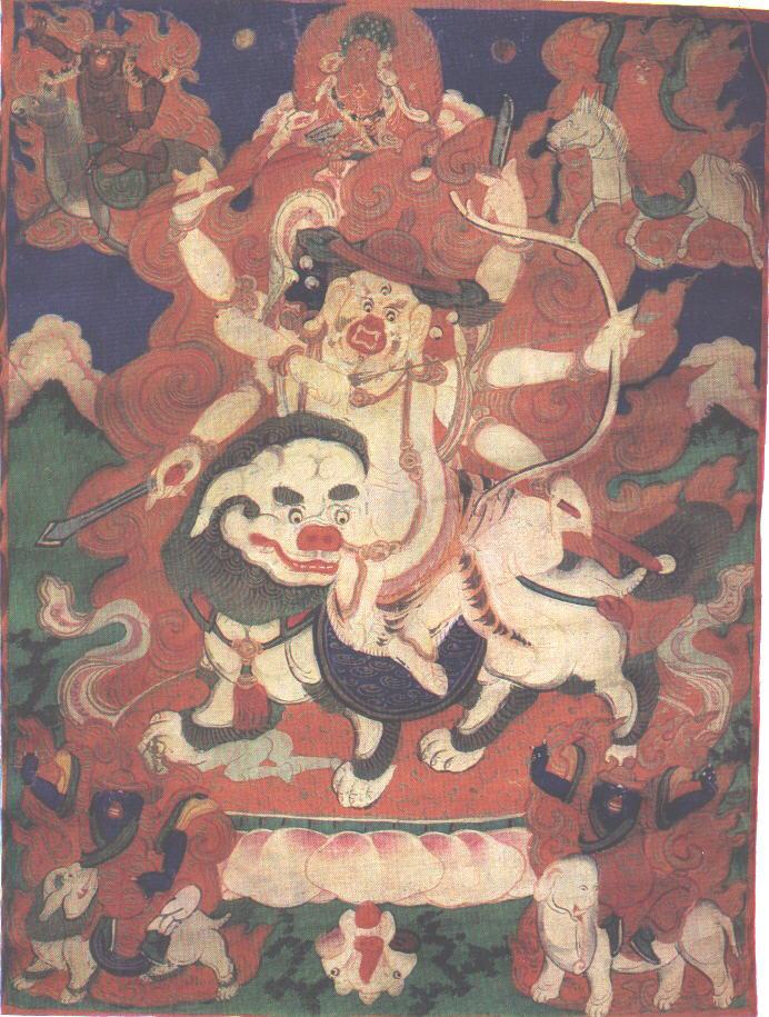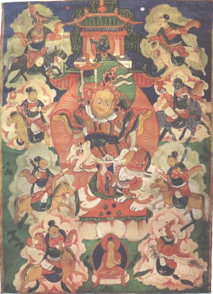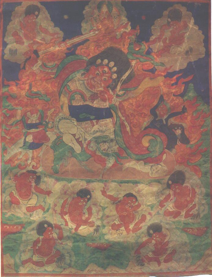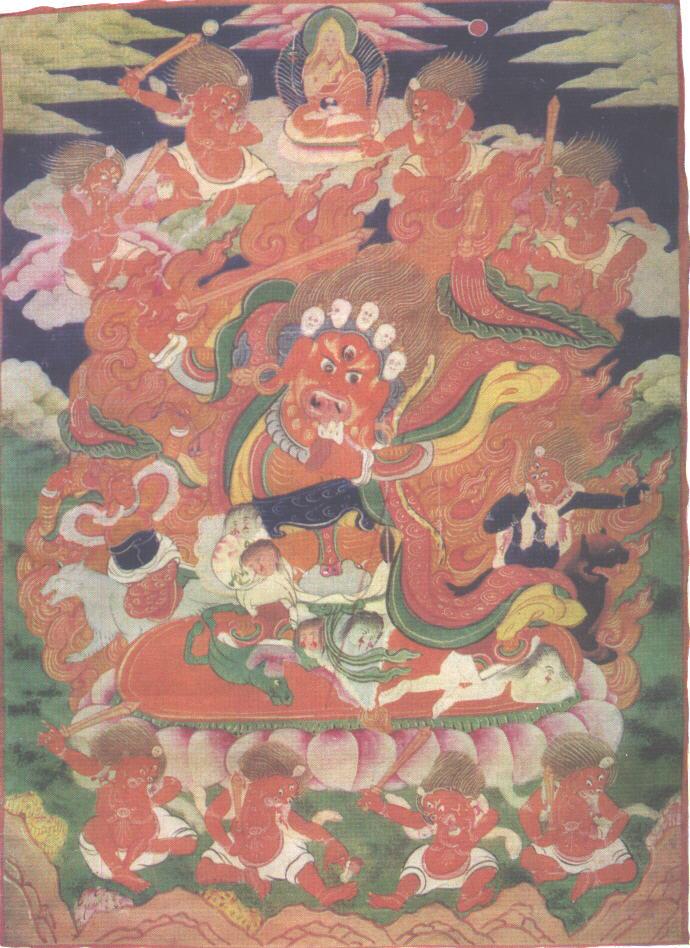 Дхармапала в чине бодхисатвы, семиликий, двадцатирукий, попирает врагов веры. Наверху - Будда Алмазнопрестольный. По бокам - божества, определить которые затруднительно, за исключением Мавджушри. Внизу - Лхамо, Ваджрапани и Яма.