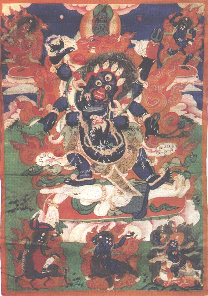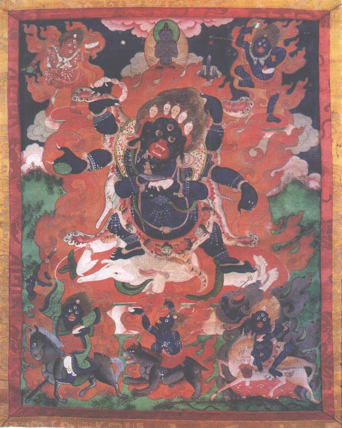 Дхармарадже подчинены локапалы севера, юга, востока и запада. Воплощается в монастыре Самъе в Тибете как глава волшебников. Культ его введен в Тибет Падмасамбхавой в VIII в. Двумя руками натягивает лук, прочие держат секиру, меч, кинжал и палицу. а голове - китайская шапка, на бедрах - тигровая шкура. Сидит на льве, с зеленой гривой, попирающем нагого человека. Престол - лотос. Фон - пламя. Над головой - красное, гневное шестирукое божество, по углам - дхармапалы на коне, муле, льве и слоне.