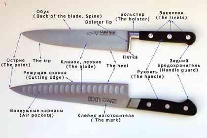 The tip и the heel обычно относятся к большим ножам ( "шеф" и "gyuto" – шеф, изготовленный в Японии), в которых каждая часть лезвия (РК) предназначена для выполнения определенной операции.