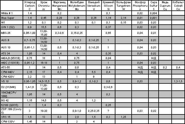 Ряд сталей, применяемых при изготовлении ножевых клинков, приведены в таблице