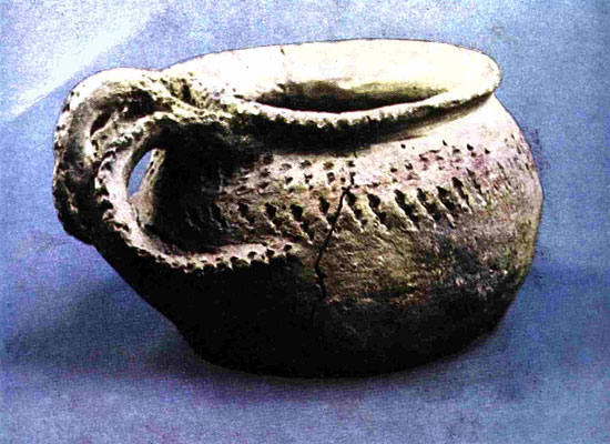 Печенежский глиняный сосуд X в. с ручкой в виде изогнутых бараньих рогов (городище Саркел — Белая Вежа, Ростовская область).