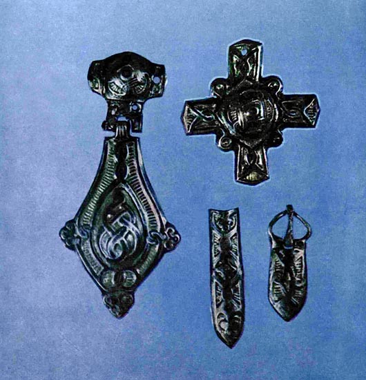 Серебряные с чернью бляхи конского оголовья из кочевнического погребения X в., раскопанного в 1971 г. А.И. Куйбышевым в Херсонской области.