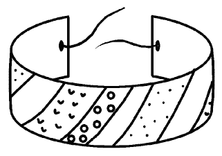 После того как все полоски будут наклеены, привяжите шнурки для завязки. Границы драпированных полосок закройте тесьмой. Для этого приклейте конец тесьмы на изнаночную сторону с одного конца браслета. Затем, смазывая клеем обратную сторону тесьмы, приклейте ее к границам драпировок, продвигаясь витками к противоположному концу изделия. Оставшийся кончик тесьмы также закрепите на изнаночной стороне браслета (рис. 138).