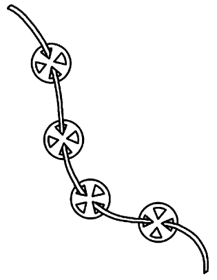 Протяните капроновую ленту через все круги, нанизывая каждый с изнанки в крайний треугольник и протягивая ленту в противоположный первому треугольник снова на изнаночную сторону. Если вы слегка натянете ленту, то она сморщится на поверхности круглой бусины в виде красивого бантика (рис. 197).
