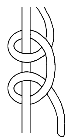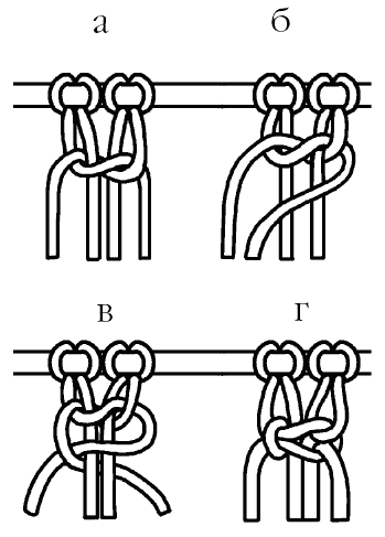 Лучше всего плести такой поясок на булавке. Для этого прикрепите к неподвижному предмету большую булавку. К ее дужке привяжите 4 шнурка. Затем 2 средних шнурка вытяните во всю длину. Они понадобятся только в качестве основы. Левый шнурок наложите на основу и проведите под правым (рис. 224).