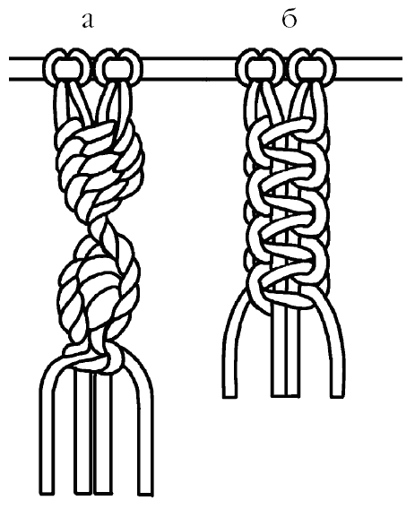 Из нескольких одинарных плоских узлов получится закрученный шнурок (рис. 217, а), а из двойных – плоская цепочка (рис. 217, б).