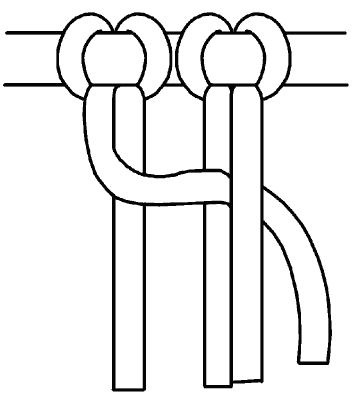 Привяжите к закрепленной булавке 4 шнурка. 2 средних шнурка станут основой для плетения. Правым боковым шнурком выполните 2 петельки (рис. 222).