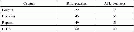 В таблице 1.5 показана доля затрат на BTL-рекламу в разных странах в общей сумме затрат на ATL и BTL [101].