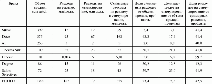В [48] отмечается: «В отдельных случаях объем затрат на стимулирование может составлять до 65 % всего бюджета против 35 % на рекламу». В [49] говорится: «Десять лет назад (в 1990-е гг.) соотношение расходов на рекламу и мероприятий по стимулированию сбыта составляло 60:40. Сегодня во многих компаниях-производителях фасованных потребительских товаров на стимулирование сбыта приходится 75 % бюджета маркетинговых коммуникаций (при этом на стимулирование торговых работников тратится примерно 50 %, на стимулирование потребителей – 25 % бюджета)». В [53] приводятся данные анализа расходов на маркетинговые коммуникации в Европе: в 1997 г. наиболее важной статьей затрат на продвижение в Европе был прямой маркетинг (20,6 %), за ним следуют реклама в печатных изданиях (19,2 %), стимулирование сбыта (18,1 %) и телевизионная реклама (15,3 %). Доля затрат на стимулирование в общем бюджете маркетинговых коммуникаций составила от 15,7 % в Германии до 35,2 % в Бельгии. В таблице 1.6 приведены данные по затратам на рекламу и стимулирование некоторых производителей косметики и средств личной гигиены в США в 2001 г. [101].