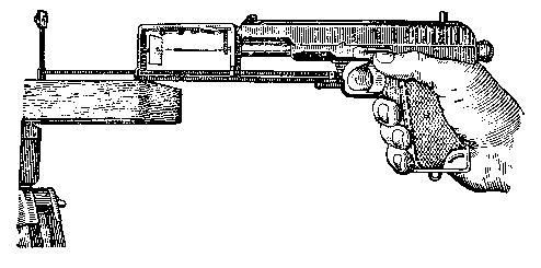 На рис. 28 изображен тренировочный прибор, который фиксирует положение линии прицеливания в момент спуска курка. Прибор устанавливается на передней части пистолета. Перед стрелком примерно на уровне его глаз ставится подставка с полочкой, на которой находится конец рычага прибора. Прицеливание производится по уменьшенной установленной на стойке мишени, положение которой при выверке согласуется с направлением иглы.