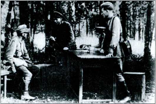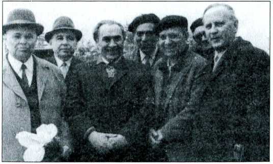 Чекисты, сражавшиеся в тылу врага на территории Орловской области, — К. Ф. Фирсанов (третий слева)и Д. В. Емлютин (четвертый слева).