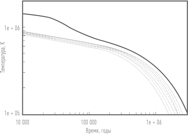 Итак, недра становятся изотермичными, но тут надо сделать два замечания. Во-первых, изотермичность не распространяется на самые внешние слои – кору. А наблюдаем-то мы именно их! Пока регистрация нейтрино из недр остывающих нейтронных звезд остается далеко за пределами наших технических возможностей (мы можем лишь регистрировать нейтринную вспышку при коллапсе, что однажды удалось сделать, когда в 1987 году наблюдалась сверхновая в Большом Магеллановом облаке). Поверхность типичной нейтронной звезды гораздо холоднее ядра. Например, если внутри