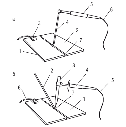 Рис. 2. Электродуговая сварка: а – плавящимся электродом: 1 – деталь; 2 – сварочная дуга; 3 – зажим; 4 – электрод; 5 – электродержатель; 6 – провод; 7 – кромка; б – неплавящимся электродом: 1 – деталь; 2 – присадочный материал; 3 – электрод; 4 – электродержатель; 5, 6 – провод; 7 – сварочная дуга