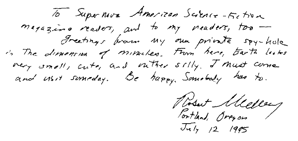 Приветствую читателей «Сверхновой» и всех своих читателей из своей личной ячейки в координатах чудес. Земля отсюда смотрится маленькой такой и довольно смешной. Надо бы наведаться. Будьте счастливы. Кто-то ведь должен.