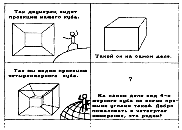 Чем можно ограничить размерность мира? А помещается ли (см. рис.) четырехмерная мысль в трехмерном разуме? Или вот еще вопрос — какова толщина той трехмерной страницы четырех и более — мерной книги, где, возможно, записаны параллельные трехмерные миры, один из которых кажется таким реальным. И не приходится ли нам довольствоваться лишь тенями объяснений?