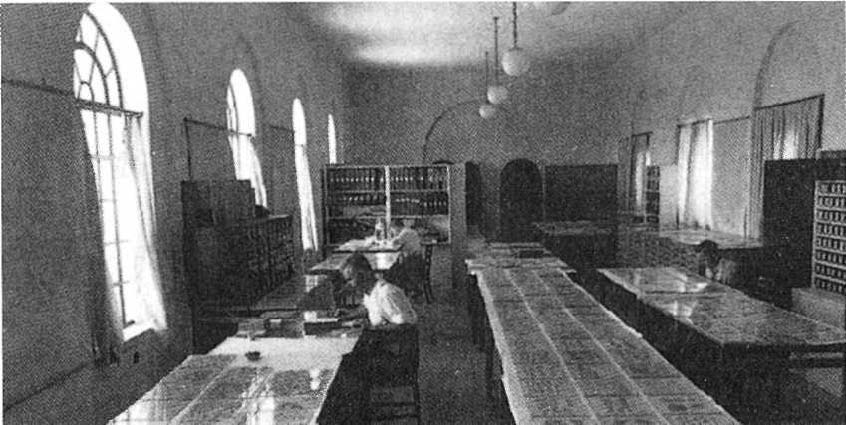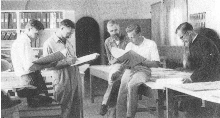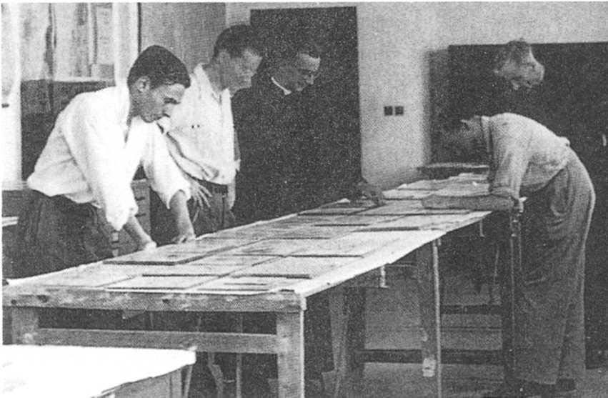 23. Отец Милик, в окружении доктора Хунципгсра и отца Бенуа, за изучением недавно приобретенных фрагментов (январь 1956 г.). Фрагменты эти, по-видимому, были найдены в пещере 11.