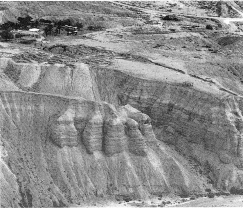 28. Кумран. Хорошо видны мергелевые террасы. Этот снимок был сделан из развалин, если смотреть па запад, в сторону Иудейских холмов. Крайняя слева – пещера 5, чуть правее – два входа в пещеру 4. Первоначальный вход в пещеру 4 находится над правым входом.