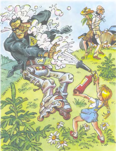 Напролом рывком открыл крышку багажника, и в тот же миг в лицо ему ударила мощная струя белой пены из огнетушителя. Кибер схватился руками за голову, пошатнулся и присел. Пена ослепила его. Алёнка, не теряя времени даром, вылезла из багажника, огляделась по сторонам и, остановив свой взгляд на связанных Кощее и Кикиморе, рассмеялась.