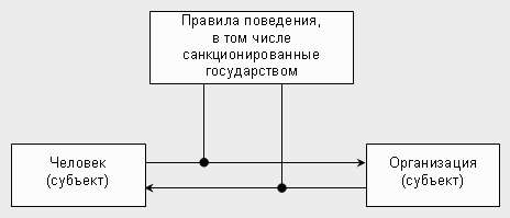 Верхняя схема в данном случае показывает, что между субъектами возникают различные отношения, часть из которых регулируется или может регулироваться правом.