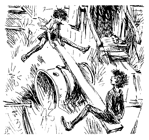 Глухо стонала опрокинутая бочка, содрогалась и скрипела переброшенная через нее доска, но жалобы их были не слышны, потому что на весь двор хохотали двое отчаянных мальчишек. Еще недавно доска была частью тротуара, а бочка стояла под водосточной трубой. Но теперь это были качели. Илька на одном конце доски, Владька – на другом. Вверх– вниз! «Бедная Владькина тетка», – подумал Генка.