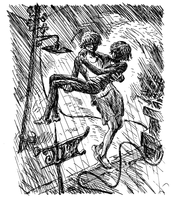 Теперь Генке надо было сделать шаг. Вернее, два шага: перенести через проволоку сначала одну, потом другую ногу. И это было самым трудным. Едва он отрывал одну ступню от крыши, как ему казалось, что вторая сейчас же скользнет по мокрым наклонным плиткам шифера. Резиновые подошвы были стерты и ненадежны. Генка решил было сбросить тапочки, но спохватился: крыша была сырая, и на ней лежал провод. А резиновые подошвы все-таки защита от тока.