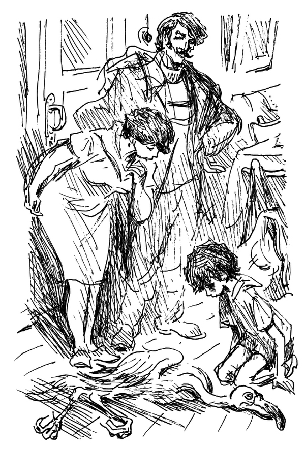 Илька сполз с сиденья и встал перед птицей на колени. Провел пальцем по розовой шее. Шелковистые перышки легко пружинили. Случайно Илька задел коленом клюв и вздрогнул: клюв был гладкий и очень холодный. Илька отодвинулся.