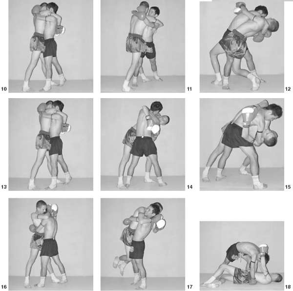 Техника выполнения: тайбоксер обхватывает двумя руками туловище противника. Приподнимает вверх. Резким скручиванием влево сваливает противника (фото 16-18).