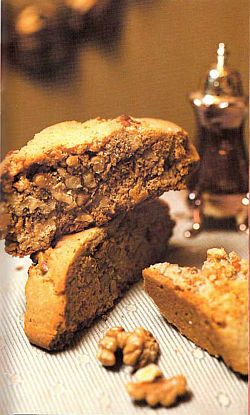 Замесить тесто, добавить грецкие орехи. Сформовать 2 колбаски и выпекать при 170 °C 20 минут. Затем охладить и порезать на порции, выпекать еще 15 минут.