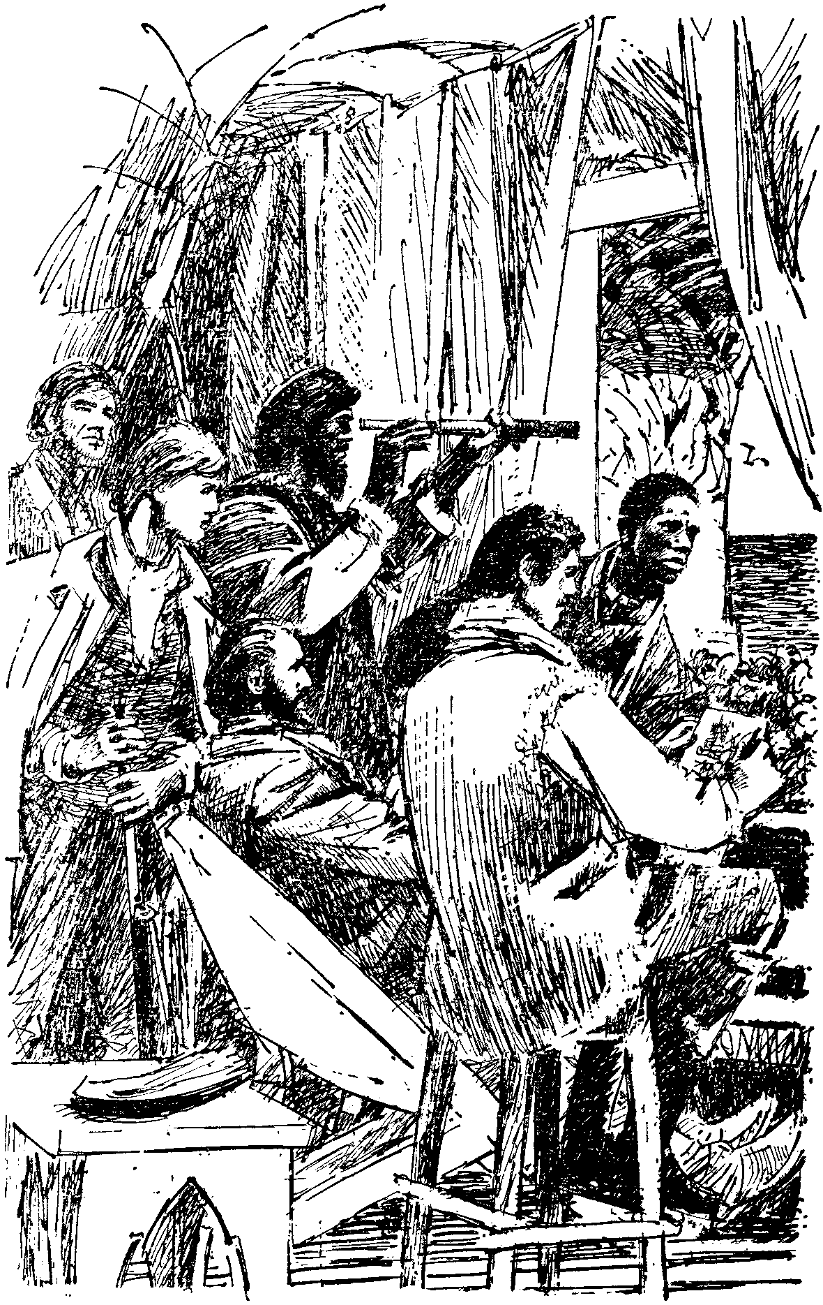 — Друзья, — начал Сайрес Смит, — возможно, что этот корабль хочет лишь издали обозреть остров. Возможно, его экипаж не сойдёт на сушу. Будем надеяться на это. Как бы то ни было, мы должны скрыть все признаки нашего пребывания здесь, на острове. Особенно бросается в глаза мельница, установленная на плато Кругозора. Пусть Айртон и Наб пойдут и снимут с неё крылья. Окна Гранитного дворца укроем ветвями. Огни надо потушить. Пусть ничто не выдаст присутствия человека на этом острове!