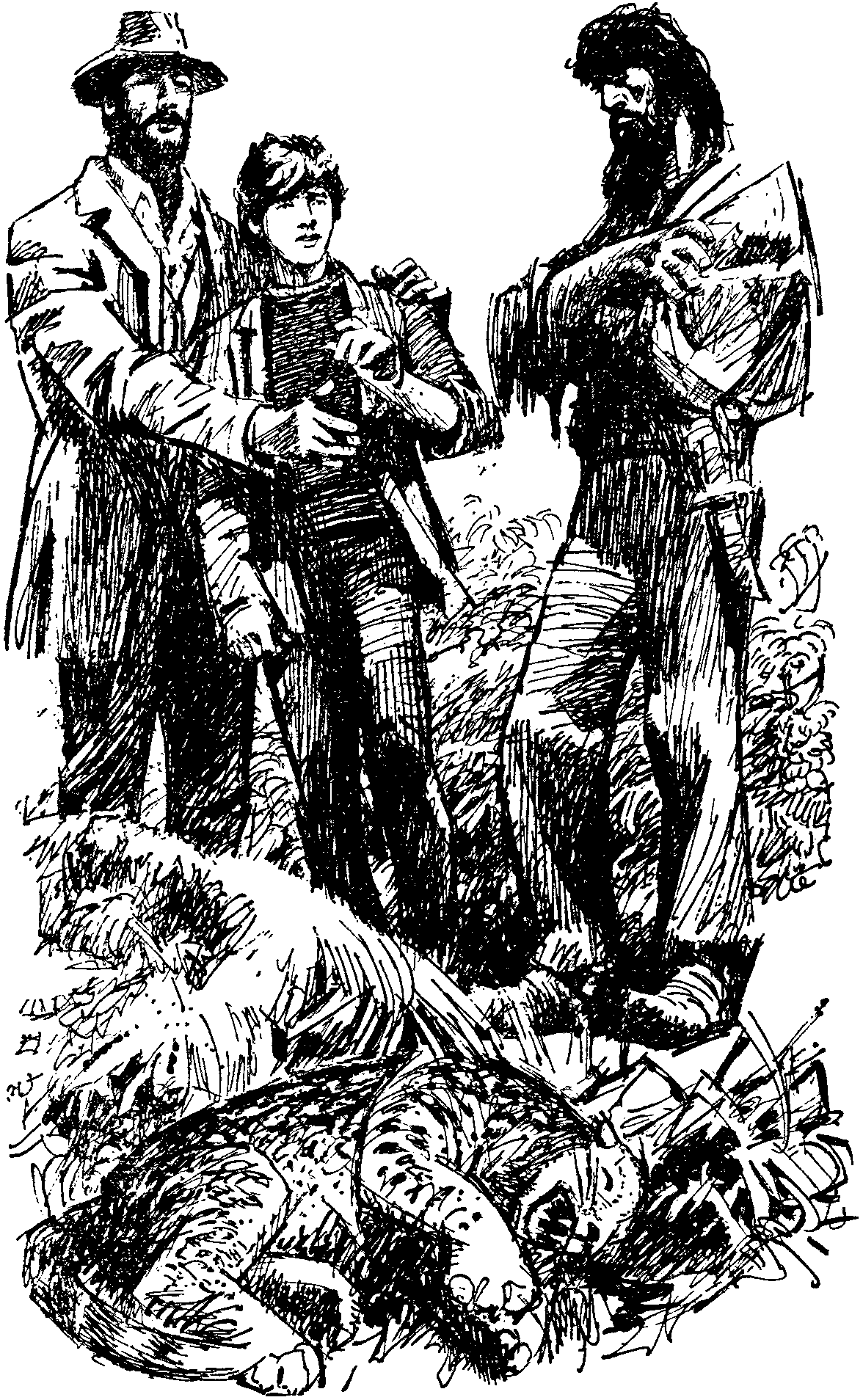 К Герберту подкрался громадный ягуар, напоминавший ягуара, убитого на Змеином мысе. Юноша был захвачен врасплох; он прислонился к дереву, а зверь, припав к земле, готовился к прыжку… И в этот миг неизвестный, выхватив нож, кинулся на хищника; зверь обернулся и напал на нового противника.
