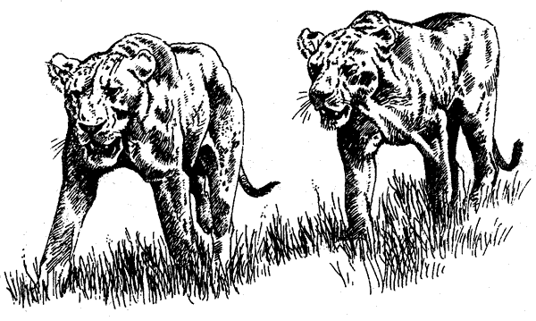 Вплоть до сегодняшнего дня, когда я пишу эти строки, львы появлялись по утрам в лагере как раз тогда, когда я просыпался — может быть, с разницей в несколько минут. Плеск воды, которую они лакают из приготовленной для них бочки, возвещает об их прибытии. Вот и утром того дня, когда пишутся эти строки, львы, не появлявшиеся в лагере пять-шесть дней, пришли лакать воду как раз тогда, когда я, потягиваясь, встаю с раскладушки — после того, как они попьют, начинается обмен приветствиями.