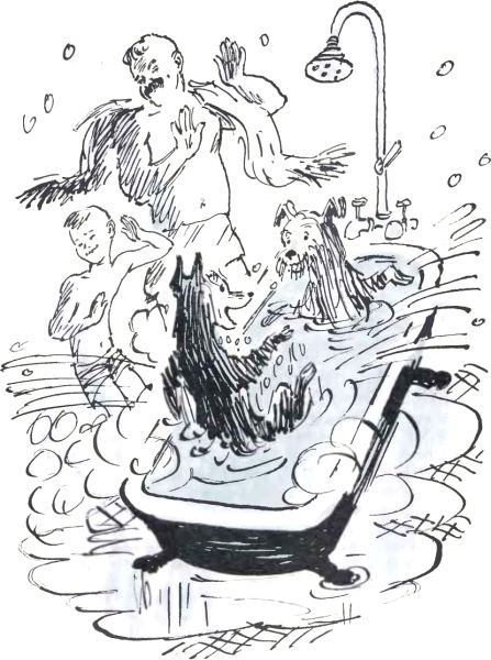 По команде Ханг и Чанг залезали в ванну и начинали там прыгать и кувыркаться. Дядя называл это «собачьей кувырколлегией». «Кувырколлегия» длилась долго. Собаки взбивали в ванне густую мыльную пену. Пена летела во все стороны. Мы с дядей бывали в пене с головы до ног. В пене была вся ванная комната.