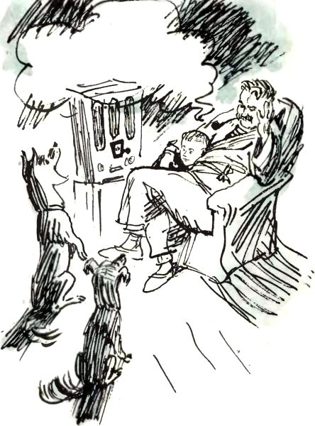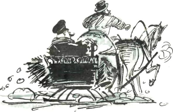 Мы с дядей сидели сзади, тепло укрытые медвежьей полостью, обшитой по краям красной бахромой, а впереди сидел кучер-лихач, помахивал кнутом и покрикивал на прохожих: «Э-э-э-бр-гись!» На кучере была толстая шуба, зелёным сукном наверх, перепоясанная красным кушаком, и зад у кучера был огромный, как подушка. Я смотрел то на этот зад, то на лошадь, то по сторонам, а по сторонам улицы были сугробы, хотя мы летели по самому центру Москвы, и снег сыпал нам в лицо, и я сразу стал весь красный, и дядя был весь красный, и на усах у него были сосульки, и когда к нам оборачивался кучер, он тоже был весь красный, а лошадь была вся белая от инея, она храпела и далеко выкидывала тонкие ноги, разбрызгивая по сторонам снег, и мы летели как ветер!