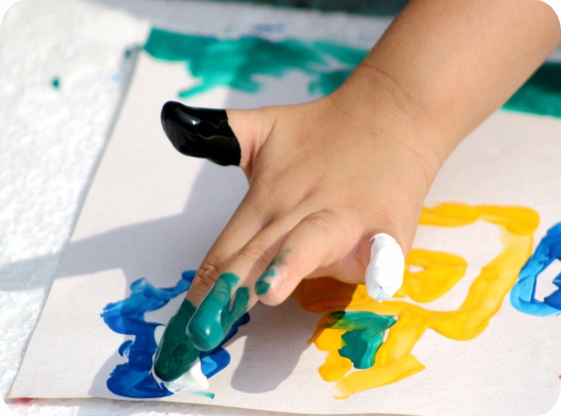 Младшая поднимает глаза, зависая кисточкой над листом.