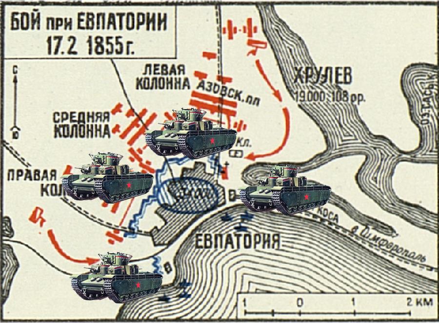 Помочь нашим, мы решили огнем и маневром. Танк был в «Камчатской» аватаре с большим Андреевским флагом и для пущей боевой логистики, Александр с Селеной, сделали целую систему порталов, чтобы, как сказал Сашка, не рвать зря гусянку. Операцию решили начать 17 февраля за час до рассвета… Сначала «Комсомолец» появился на берегу и занялся эскадрой союзников… Первым получил свою порцию плазменных бомб «Генрих IV» поднятый в воздух взрывом своих пороховых погребов. А потом танк принялся за линкоры и пароходо-фрегаты, а дальше и огненный смерч прошел по батареям Евпатории. Прыгая из портала в портал мы последний удар нанесли по кавалерии Союзников, и в воздух взмыли стаи ярео-красных ракет, ну а с пехотой разбирались уже тридцать шесть пехотных батальонов генерала Хрулева, которого среди ночи разбудил фельд-егерь с пакетом от государя, приказывающим начать атаку на рассвете, после серии взрывов в городе и на рейде, по красному салютационному сигналу. К обеду Евпатория пала и единственным минусом в этом рейде было то, что Светлейший князь, генерал-адъютант и адмирал Меншиков избежал отставки, но осада Севастополя успехом у Союзников не увенчалась. Победа под Евпаторией изменила настроение в обществе и к Севастополю подошли подкрепления из созданного ветеранами и юнкерами Народного ополчения и в конце концов Союзники заключили с Россией мир, по которому из за хромой российской дипломатии, на суше мы свое удержали и с прибытком, но Черное море стало демилитаризованным.