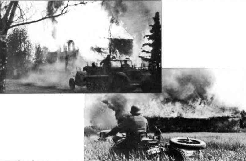 Верхний снимок — Полугусеничный тягач Sd. Kfz 10 с пушкой Pak-36 на прицепе на улице горящей русской деревни, конец июля 1941 г. Противотанковые орудия использовались на Восточном фронте не только для борьбы с бронетехникой, но и как обычная полевая артиллерия.