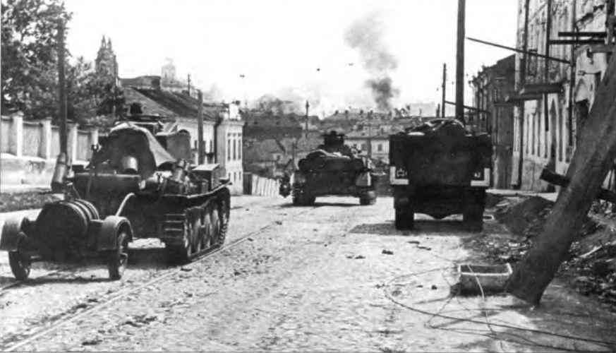 Снимок первых дней операции «Барбаросса». В кадр попала техники штаба танкового полка — на задней части башни танка PzKpfw. II нанесена буква «R». Вероятно, машины принадлежат 7-й танковой дивизии, первой вступившей на улицы Минска.